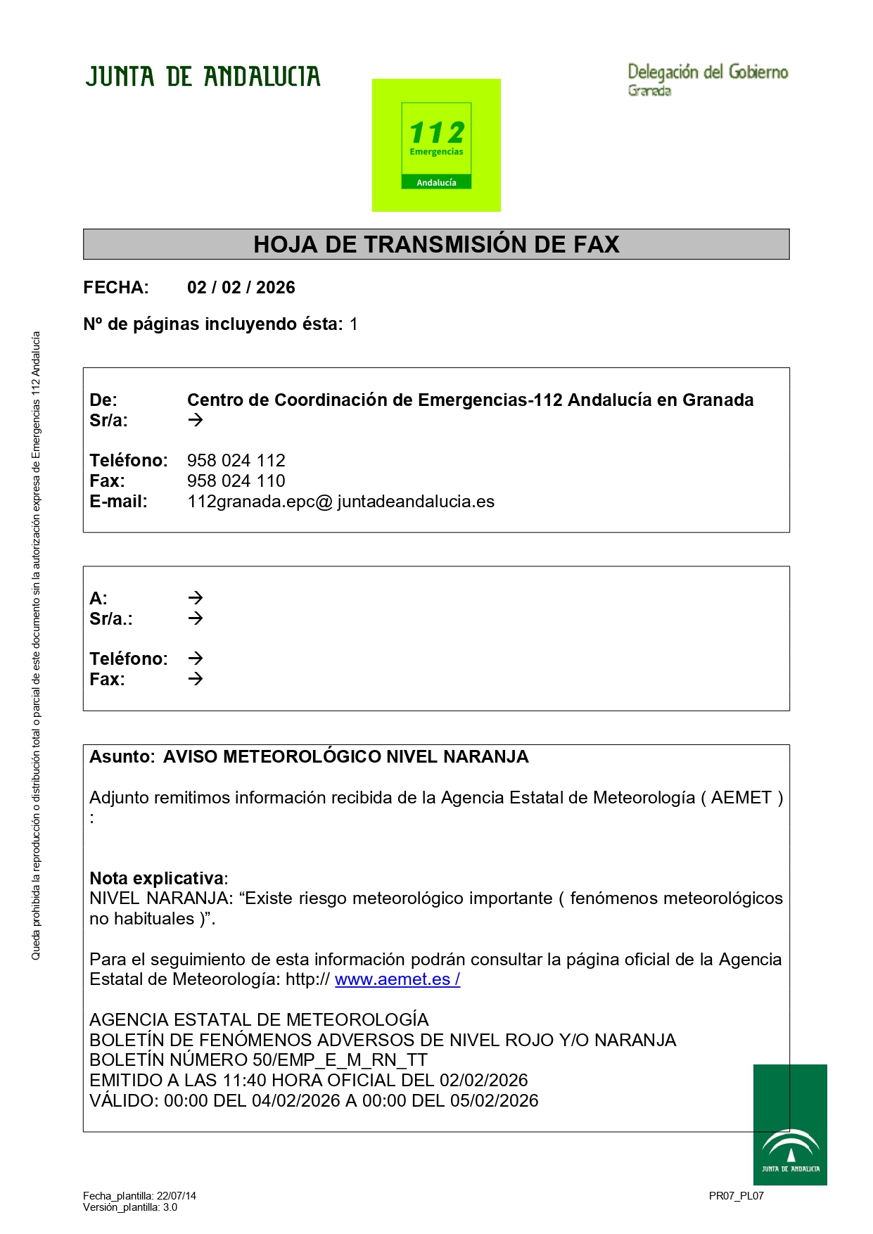 Aviso metereológico importante . Alerta naranja durante todo el día 5 de febrero de 2026