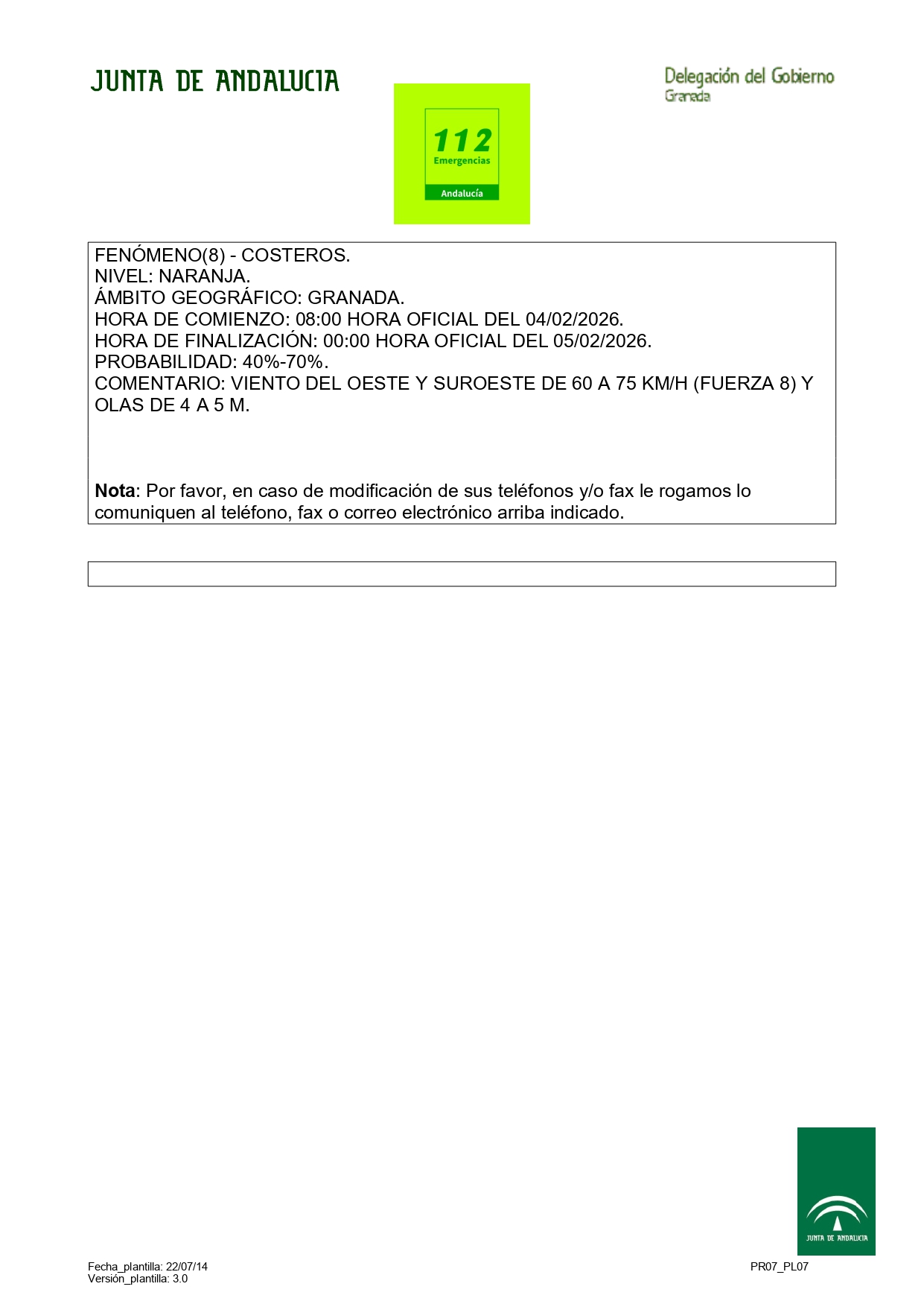 Aviso metereológico importante . Alerta naranja durante todo el día 5 de febrero de 2026