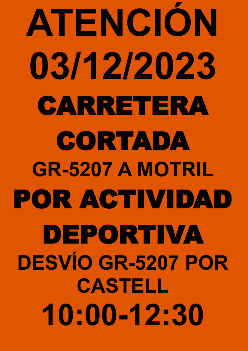 El domingo día 3 de diciembre, la carretera que va de Lújar a Motril por El Conjuro GR-5207 ,estará cortada desde las 10 de la mañana hasta las 12:30 del mediodía